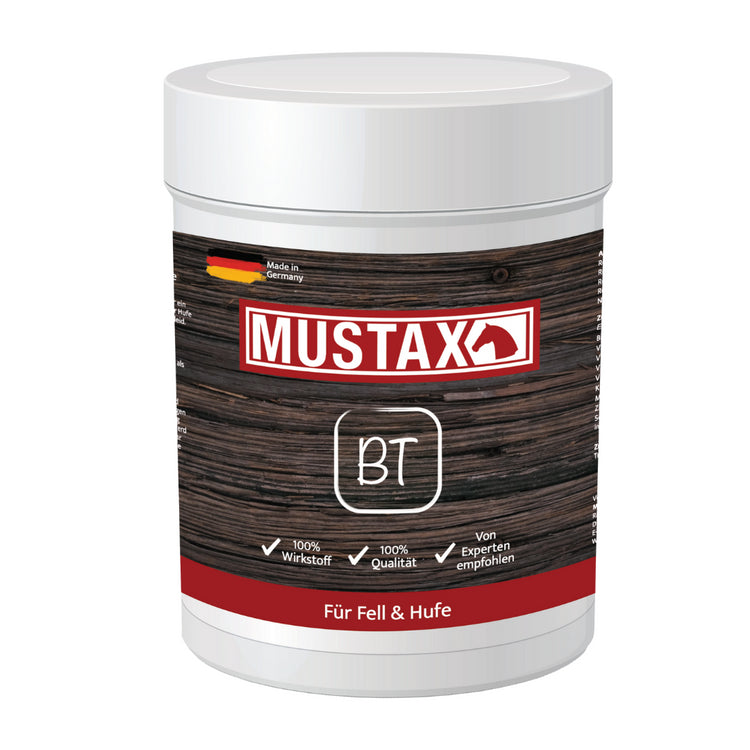 - MUSTAX BT bevat een hoog gehalte aan biotine, dat belangrijk is voor een regelmatige hoefgroei en de ontwikkeling van een volle, glanzende vacht. Biotine helpt de hoeven te versterken en te onderhouden en houdt de vacht gezond en glanzend.